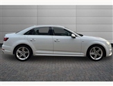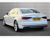 Audi drive select, Audi Pre sense collision avoidance, Audi smartphone interface, Auto boot lid opening, Electro-mechanical PAS, Service interval indicator, Stop/start button, Voice control system, 2 USB ports, Aux input, DAB digital radio module, MMI radio plus with CD player, Acoustic windscreen, Air inlets in titan black with two horizontal inlays in chrome, Auto dimming rear view mirror, Automatic headlights + automatic windscreen wipers, Body colour bumpers, Chrome door handles, Chrome rolled exhaust, Electric adjustable heated door mirrors, Electric front windows, Electric rear windows, Headlight range control, LED daytime running lights, LED indicators in door mirrors, Rear diffuser in Twilight grey matt, Roof spoiler, 3 zone climate control, Black cloth headlining, Front centre armrest with 12v socket, Front sport seats, Front/rear floor mats, Gearshift paddles, Illuminated door sill finishers, Isofix child seat preparation for front passenger/outer rear seats inc passenger airbag deactivation, Jack and tool kit, Perforated leather gearknob, Reach + rake adjustable steering column, Rear headrests, Split folding rear seats, Stainless steel foot rest, Stainless steel pedals, Sunvisors with vanity mirrors, Top tether anchor plate for isofix child seat, S line exterior styling pack - A4 Saloon, 3 point seatbelts on all rear seats, ABS/EBD, Adaptive driver and front passenger airbags, Electromechanical parking brake, ESP, First aid kit, Front head airbags, Front seatbelt pretensioners + load limiters, Front side airbags, Multi-Collision braking, Seatbelt warning, Traction control, Tyre pressure monitoring system, Warning triangle, Keyless Start, Locking wheel bolts, Remote central locking, Thatcham category 1 alarm + immobiliser,