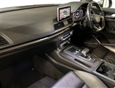 Audi connect, Audi drive select, Audi smartphone interface, Driver information centre with colour display in instrument panel, MMI Navigation plus, Power tailgate, Remote electric boot opening/closing, Service interval indicator, Voice control system, 2 USB ports, 2x SD card slot, Audi sound system, Auxiliary input socket, CD player, DAB Digital radio, MMI radio plus with 7"colour MMI screen and MMI controller, Acoustic windscreen, Aluminium roof rails, Aluminium sill plates, Auto dimming rear view mirror, Black high gloss front air inlet in matt aluminium effect, Body colour bumpers, Body colour door mirrors, Body colour rear diffuser insert, Chrome exhaust tailpipe, Electric headlight adjustment, Electrically adjustable and heated door mirrors, Front and rear electric windows, Front fog lights, Headlight range control, Headlight washers, High beam assistant, Honeycomb side air inlet in titan black, Light and rain sensor for auto activation of lights and windscreen wipers, Loading sill protector in stainless steel, Privacy glass with front acoustic glazing, Rear diffuser strip in matt aluminium silver, Rear spoiler, Rear wiper, S Line side skirts, Selenite silver underbody guard, Twilight grey matt radiator grille with matt aluminium horizontal chrome struts, 3 rear headrests, 3 zone climate control, 4 way electric lumbar support for driver and front passenger, 40:20:40 split folding rear bench seat, Black cloth headlining, Fine Nappa leather upholstery, Front centre armrest with 12v socket, Front sports seats, Front/rear floor mats, Height adjustable driver's seat, Height adjustable front head restraints, Illuminated door sills, Isofix front passenger and rear seat preparation, Jack and tool kit, Load compartment cover, Luggage compartment carpet, Matt selenite silver door inserts, Perforated leather gearknob, Reach + rake adjustable steering column, Rear seat bench plus with through load+rear centre armrest+cupholders, Removable luggage compartment floor, Removable net partition, Roller blind loadspace cover, Stainless steel pedals, Sunvisors with vanity mirrors, Extended interior upholstery pack - Q5, Non Smokers pack, 3 point seatbelts on all seats, ABS, Curtain airbags, Driver and passenger airbags, Driver and passenger side airbags, Electromechanical parking brake, ESC with ASR, ESP, First aid kit, Front passenger airbag deactivation, Hill descent control, Seat belt force limiter, Seatbelt warning lamp, Traction control, Tyre pressure monitor, Warning triangle, Keyless Go access/ignition system, Locking wheel bolts, Remote central locking, Thatcham category 1 alarm + immobiliser, Fine Nappa leather with diamond pattern stitching,