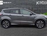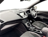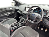 Apple car play/Android Auto, Enhanced active park assist including perpendicular parking pull out assist, flank guard and front/rear parking sensor, EPAS, Hands free telephone, Trip computer, Sports suspension, 2 USB ports, Auxiliary socket for external device, Remote audio controls on steering wheel, Auto dimming rear view mirror, Body colour bumpers, Body colour rear spoiler, Body styling kit - Body colour front/rear/side skirts, door claddings, wheel arches, high gloss black rear mesh, silver skid plate and rear diffuser, Electrically operated and heated door mirrors with side indicators, Electrically operated front and rear windows with global closing, Front fog lights, Front scuff plate, Power folding door mirrors, Quickclear heated windscreen, Rain sensing wipers, Tailgate wash/wipe, Twin exhaust pipes, 6 way manually adjustable driver's seat with lumbar support, 6 way manually adjustable passenger seat with lumbar support, 60/40 split/folding rear back and cushion, Alloy Foot Pedals, Auxiliary power socket in luggage area, Centre console with stowage tray/bottle holder/CD stowage/front and rear 12V power point, Dark headliner, Driver/passenger front seatback pockets, Dual electronic automatic temperature control, Flat bottomed leather steering wheel with red stitching + gear knob, Floor mats with red stitching, Folding rear centre armrest, Footwell courtesy lights front and rear, Front head restraints, Front overhead courtesy lights with theatre style dimming and delay, Front/rear reading lights, Isofix system on outer rear seats, Part leather upholstery, Reach + rake adjustable steering column, Rear head restraints, Sports style front seats, Stowage unit in upper instrument panel, Tie down hooks, Tonneau cover, Variable intensity instrument illumination, Appearance pack - Kuga/ST-Line, 3 point seatbelts on all 3 rear seats, ABS/EBD, Airbags - front driver/passenger, front & rear side, curtain, drivers knee, EBA, Electric traction assist system, Electronic Stability Programme, Front passenger airbag deactivation switch, Hill start assist, Intelligent Protection System (IPS), Tyre pressure monitoring system, Engine immobiliser, Keyless entry, Keyless start with 'Ford Power' starter button, Locking wheel nuts, MyKey system, Remote powered central double locking doors, Thatcham category 1 alarm, Mini steel spare wheel,