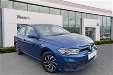 Volkswagen Polo 1.0 TSI Life 5dr 5 Door in blue, Adaptive cruise control without follow-to-stop and speed limiter, Bluetooth mobile phone interface, Driver alert system, Emergency call service, Front assist system, Power assisted speed sensitive ste