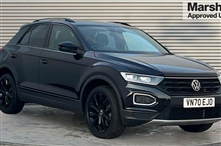 Volkswagen T-Roc 1.5 TSI EVO Black Edition 5dr DSG 5 Door in black, 'Lights On' Reminder warning buzzer, Adaptive cruise control with front assist, radar sensor controlled distance monitoring, city emergency braking, App-Connect, Automatic start/stop system, Bluetooth