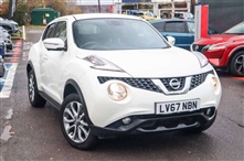 Nissan Juke 1.2 DiG-T Tekna 5dr 5 Door in white, Around View Monitor, Blind spot monitoring, Bluetooth system, Colour rear view camera, Cruise control + speed limiter, Electric speed sensitive power steering, Lane departure warning system, Moving ob