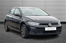Volkswagen Polo 1.0 TSI Life 5dr DSG 5 Door in black, Adaptive cruise control with follow-to-stop and speed limiter, Bluetooth mobile phone interface, Driver alert system, Emergency call service, Front assist system, Power assisted speed sensitive steeri