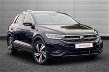Volkswagen T-Roc 1.5 TSI R-Line 5dr 5 Door in black, 10.25"Digital cockpit pro, Bluetooth mobile phone interface, Driver alert system with fatigue detection, Driver tips and journey analysis, Emergency call service, Lane keeping system Lane Assist, Modi