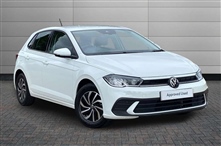 Volkswagen Polo 1.0 TSI Life 5dr 5 Door in white, Adaptive cruise control without follow-to-stop and speed limiter, Bluetooth mobile phone interface, Driver alert system, Emergency call service, Front assist system, Power assisted speed sensitive ste