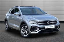 Volkswagen T-Roc 1.5 TSI R-Line 5dr DSG 5 Door in silver, 10.25"Digital cockpit pro, Advanced driver attention and drowsiness monitor, Emergency call service, Lane keeping system Lane Assist, Mobile phone interface, Modified key software - reduce switch off