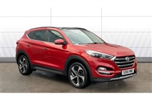 Hyundai Tucson 2.0 CRDi Premium SE 5dr 5 Door in red, 8"touchscreen DVD colour navigation, Blind spot monitoring, Bluetooth system, Cruise control + speed limiter, Digital clock, Emergency stop signalling system, Flex Steer variable steering settings, Fr