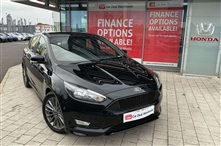 Ford Focus 1.5 EcoBoost ST-Line 5dr 5 Door in black, Digital clock, Easy fuel capless refuelling system, Eco mode, Electric boot release, PAS, TFT cluster screen, Trip computer, Sports suspension, Aux input, Steering column with mounted audio controls,