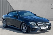 Mercedes-Benz E-Class Cabriolet E220d AMG Line Premium 2dr 9G-Tronic 2 Door in black, 360 degree parking camera, Active parking assist including front and rear parking sensors, Analogue clock, Attention assist, Automatic boot separator, Blind spot assist, Bluetooth interface for hands