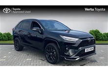 Toyota RAV4 2.5 PHEV GR Sport 5dr CVT 5 Door in black, 12.3"Digital Combimeter, 360 degree panoramic view monitor, Analog tachometer, Android Auto, Blind spot monitoring with rear cross traffic alert with brake assist, Bluetooth system, Cyclist Detection,