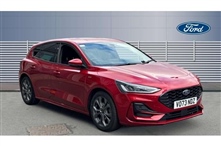 Ford Focus 1.0 EcoBoost ST-Line 5dr 5 Door in red, 4.2"Colour TFT Ice blue illumination analogue cluster with trip computer, Bluetooth system, Digital clock, Easy fuel capless refuelling system, Eco mode, Ford SYNC 4 Navigation with 13.2'' touchscreen