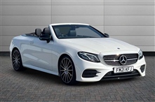 Mercedes-Benz E-Class Cabriolet E300d AMG Line Night Ed Premium+ 2dr 9G-Tronic 2 Door in white, 360 degree parking camera, Active parking assist including front and rear parking sensors, Analogue clock, Attention assist, Automatic boot separator, Brake wear warning display, Cockpit display 12.3"