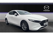 Mazda 3 2.0 e-Skyactiv G MHEV Centre-Line 5dr 5 Door in white, 10.25"display with Mazda Connect infotainment, 7"colour TFT display, Audio transfer from bluetooth devices, Blind spot monitoring with rear cross traffic alert, Colour active driving display inc Winds